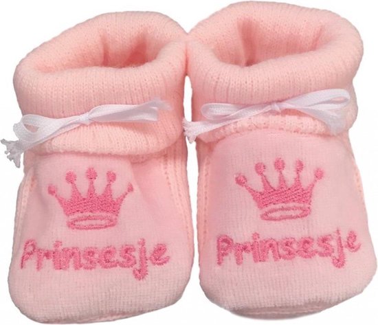 De slofjes zijn gedecoreerd met een schattig strikje en de geborduurde tekst “Prinsesje” op de neus van het slofje.