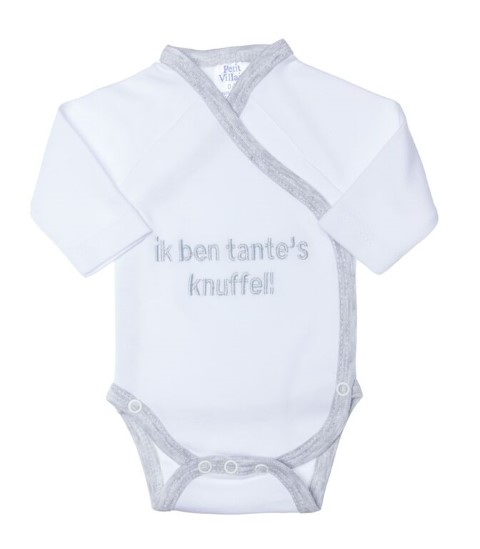 Het rompertje is eenvoudig te openen dankzij de drukknoopjes op de voorkant. Op het rompertje staat de tekst “ik ben tante’s knuffel” geborduurd.